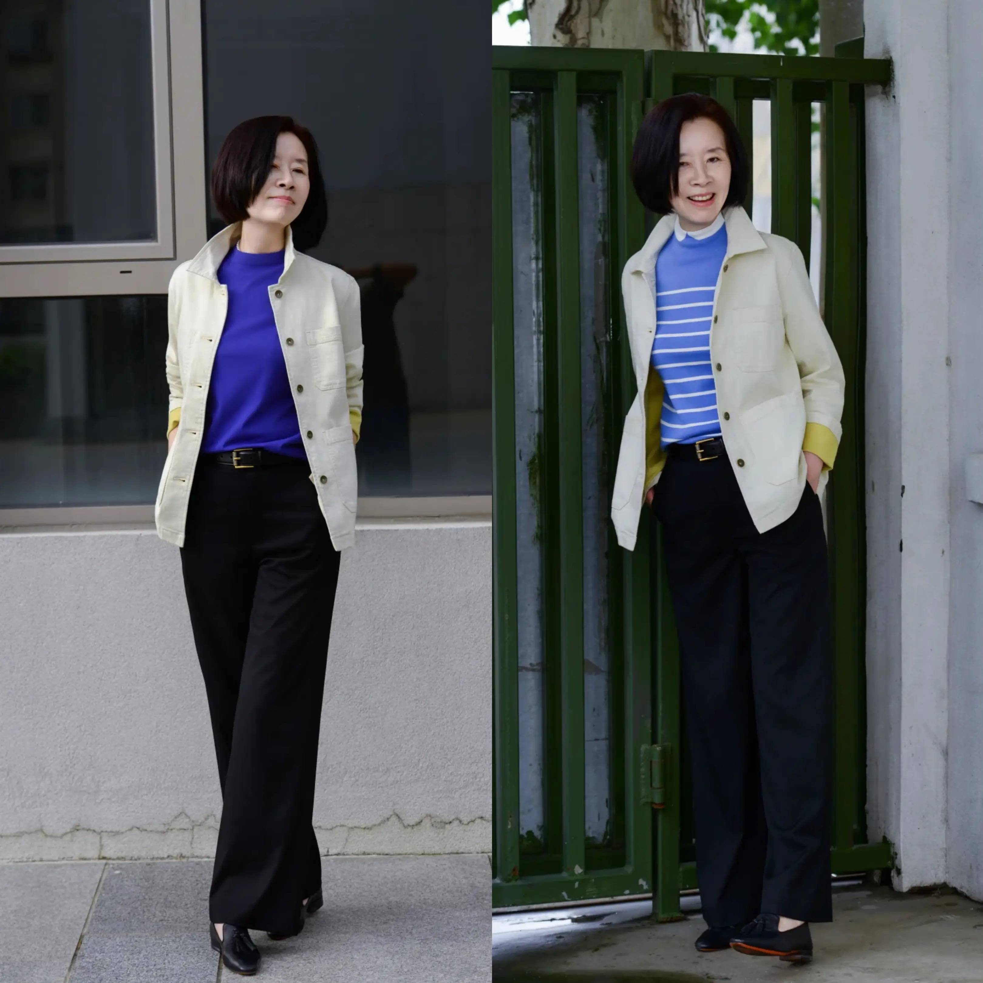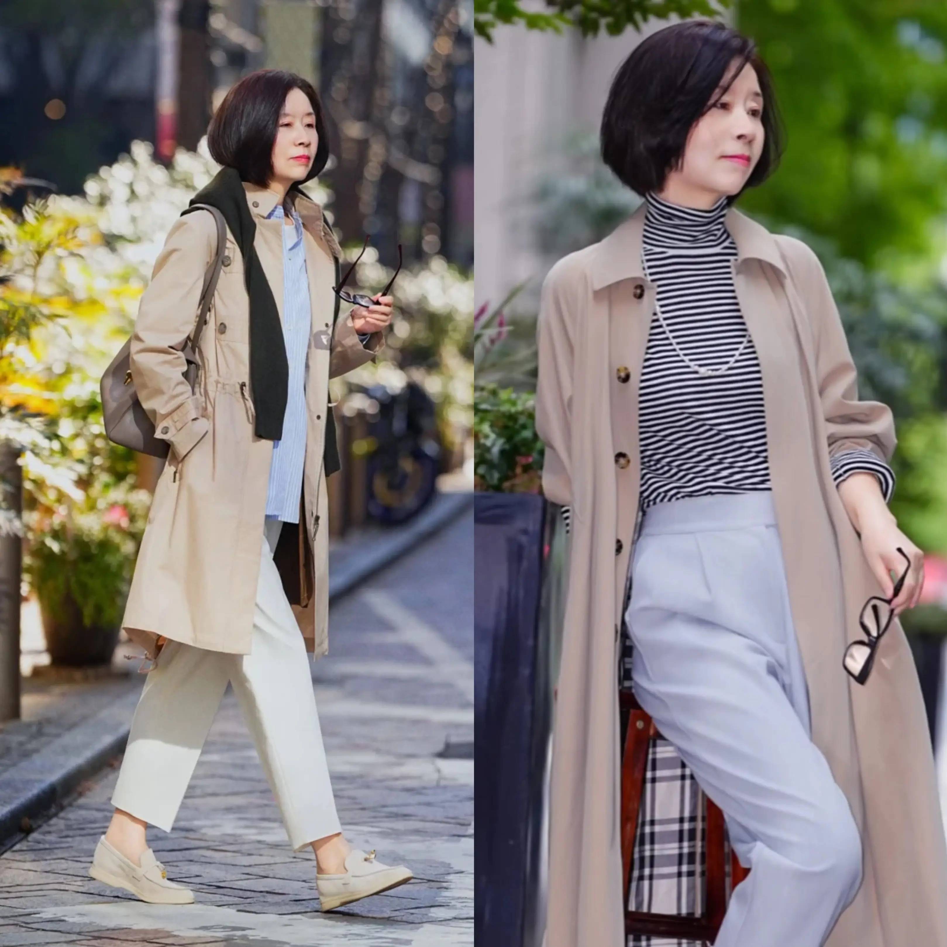 来到春季,风衣外套必不可少,尤其是经典的卡其色风衣,与同色系,比如米色,米白色,浅灰色等烟管裤组合,内搭可以选择条纹针织衫或者衬衫来突显造型亮点,将50+的成熟女性魅力完美呈现。