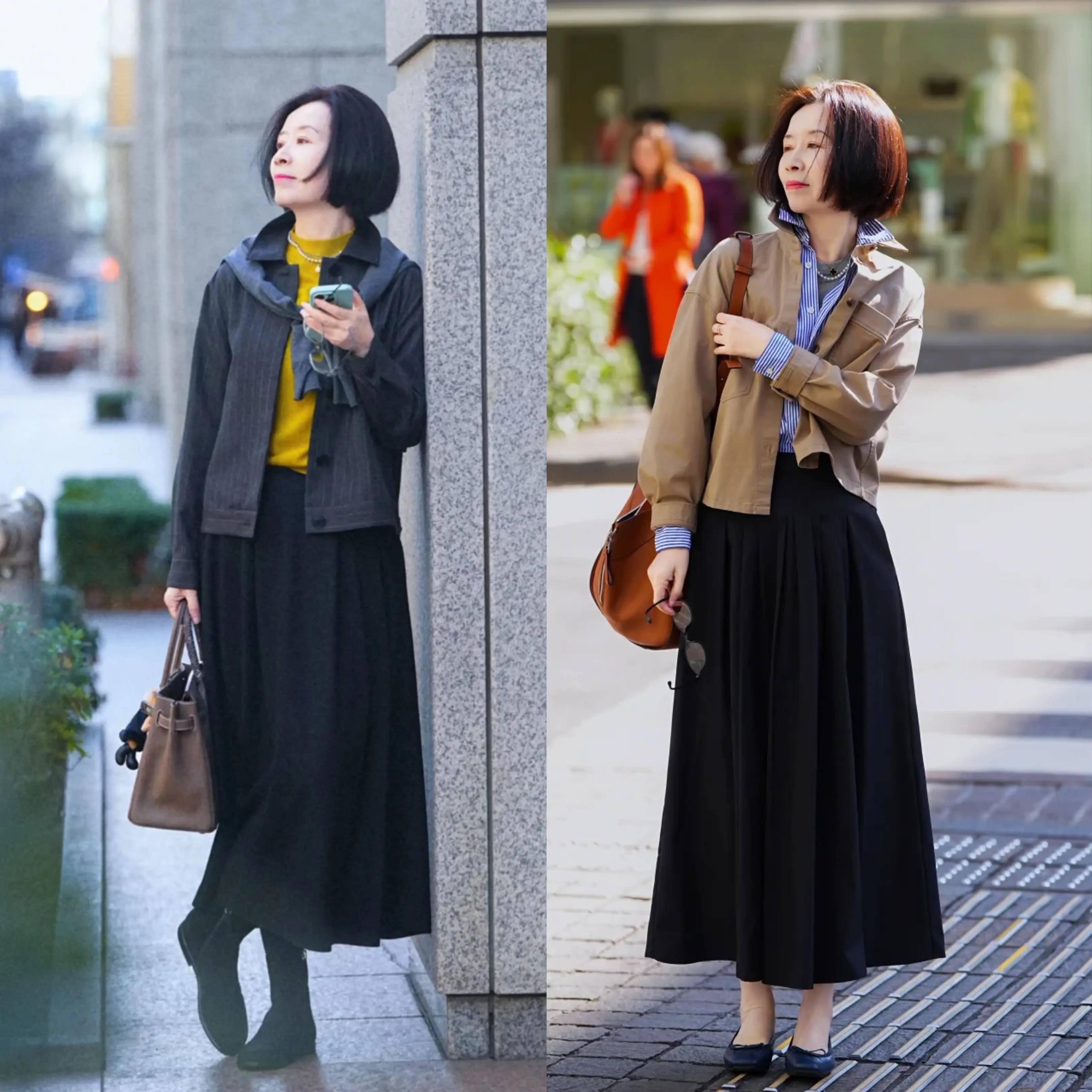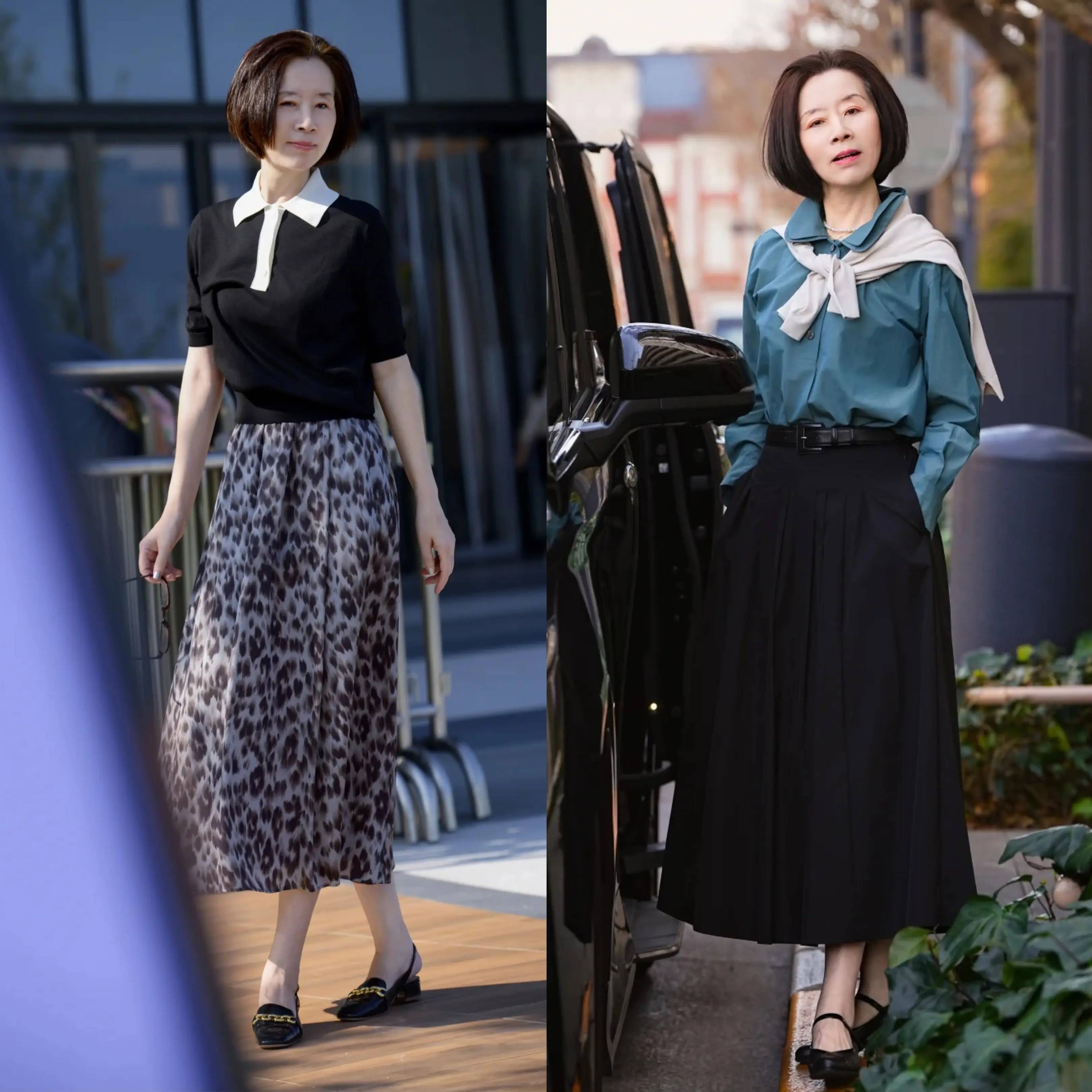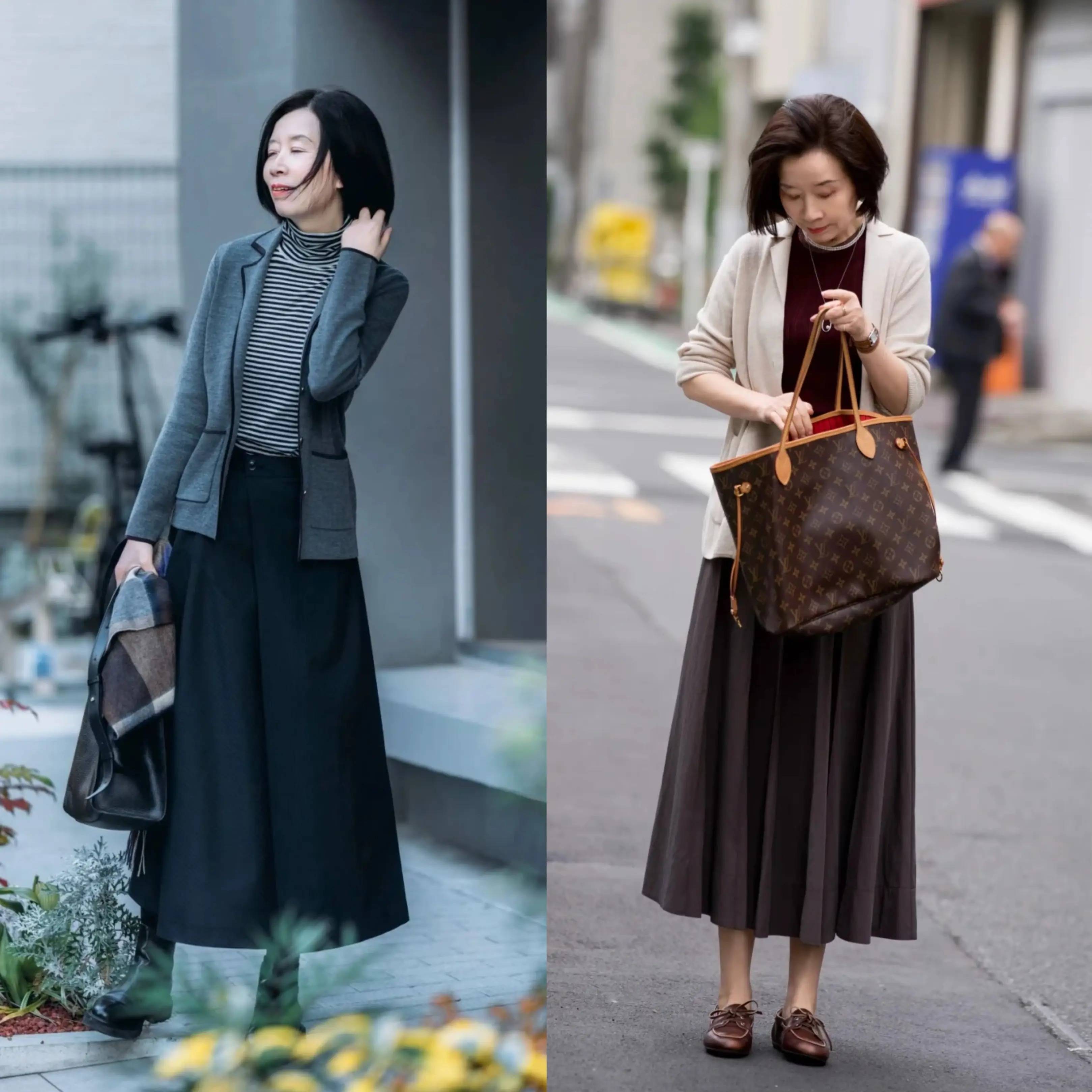 色彩选择上,更推荐沉稳大气的大地色系,如灰色、卡其色、米色、深褐色、黑色等,低调耐看又显高级。可以用针织外套搭配针织衫打底,温柔亲肤又有层次感,下半身搭配 A 字半身裙或百褶裙,既能修饰身形,又能增添柔美韵味,整体搭配优雅得体,完美凸显大龄女性的从容与气质。